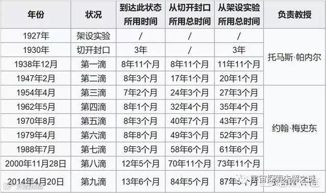 第一滴沥青于1938年12月滴下,从开封到滴下用了8年11个月,可惜的是没人看见过程,第二滴是1947年2月滴落的,可惜的是初代“沥青守护者”汤马士.帕奈尔教授没能等到第三次滴沥青,因为他在1948年去世了。