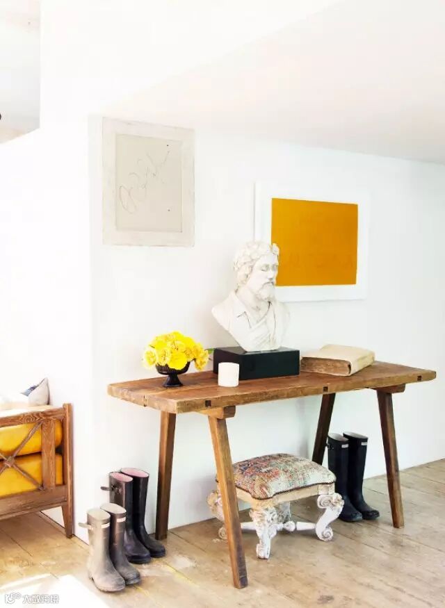 长条桌靠墙摆。老门板安上架子腿,就成了一件很棒的vintage玄关桌。▼