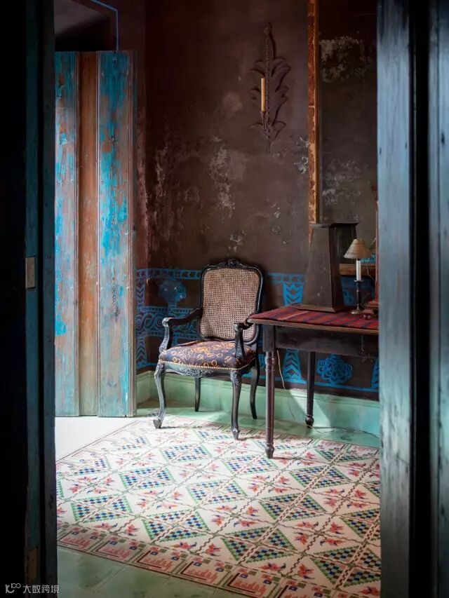 二手靠背椅和玄关桌组合,搭配斑驳的墙面和异域花纹,营造出安详宁静的氛围。▼