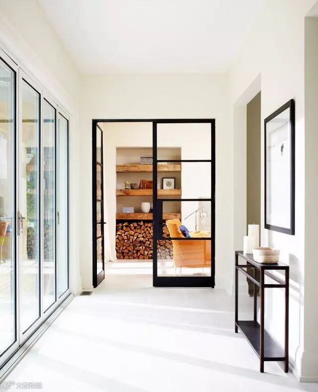 嫌桌子太占地儿,一条细窄的条案也可以代替。极简风格的框架条案,和白色空间的黑线条相得益彰。▼