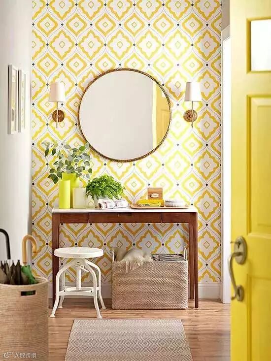 圆镜+壁灯+边桌,既是玄关置物台也是梳妆台。▼