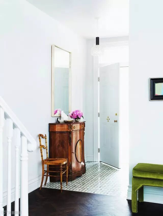 古董边柜和靠背椅典雅精致,用一面简约的镜子做过渡,不至于过于繁复而与简约的空间风格起冲突。▼