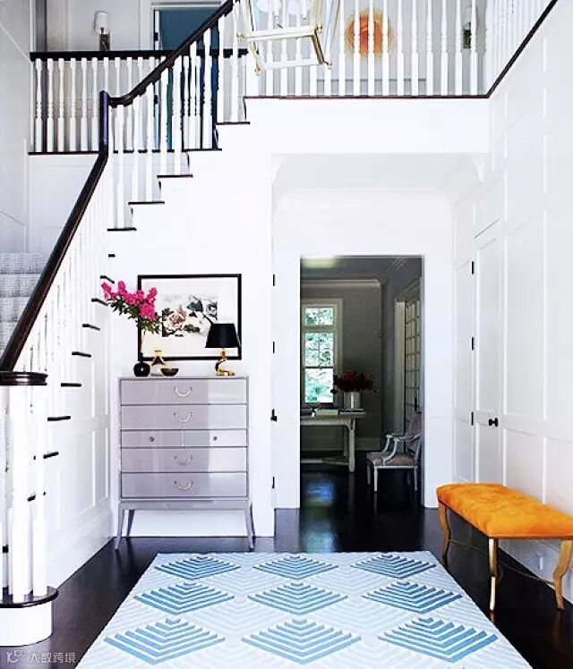 白色空间中一张橙色的玄关椅,优雅的时尚感尽显。▼