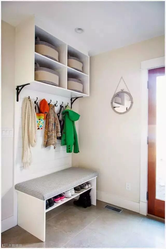 如果空间足够的话,放一把玄关椅能极大提升玄关的体验——坐下换鞋,或是等待家人换装时休息。椅子下还可以放日常穿的鞋子。