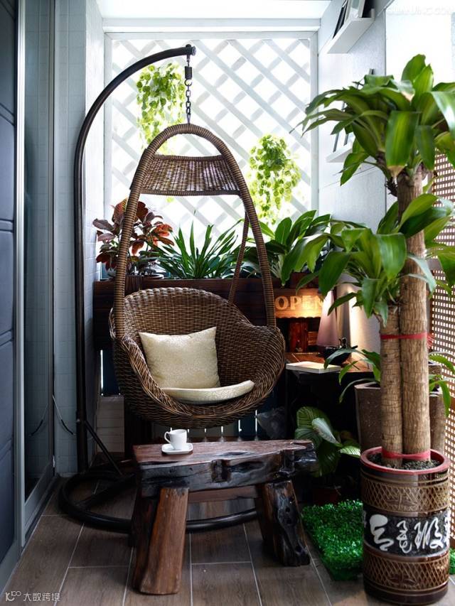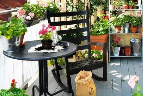 即使是花园阳台的打造,也不忘增添上舒适一角,黑色的小巧摇椅与圆台,让身体置身于这份绿色之中,惬意至极。