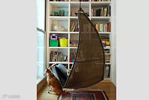 把阳台打造成书房,不仅节省空间,还有利于书房的采光。嵌入式的墙壁书架设计可以让本就狭小的阳台空间保持其空间大小,吊椅的设计非常舒服,又不会占用太多空间。