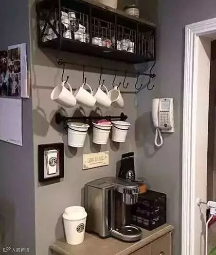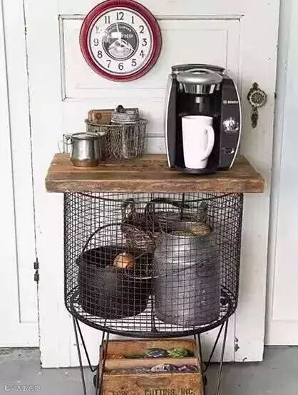 空间还不够多,那你就看看这种类型的吧台!一个咖啡机配上一个富有年代感的小门板和小铁笼组成的桌子,有着一种旧时光的感觉。