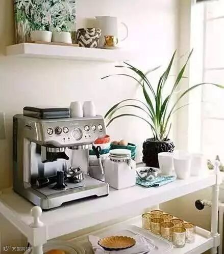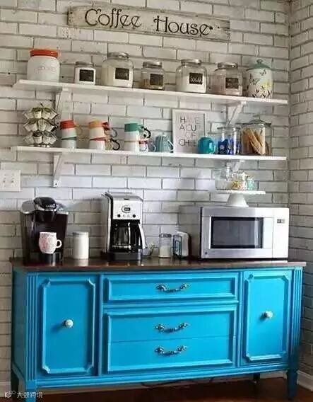 亮色系的柜子,配上白色的墙,干净又整洁,墙上的置物架还能有收纳、装饰的功能,这可不仅仅是咖啡吧台,它还是房间整体装饰的一部分哦!