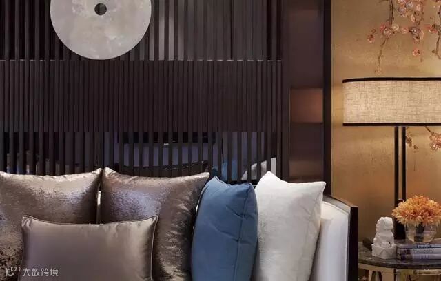 颜色优雅的抱枕,非常具有特色的台灯,整个空间有一种优雅的中式风格意境。
