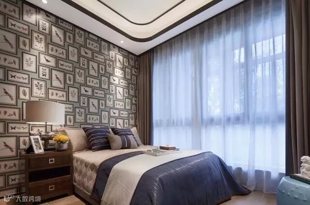 卧室床头背景墙选用了很有特色的花鸟蝴蝶画面的墙纸,将新中式风格贯穿到底。