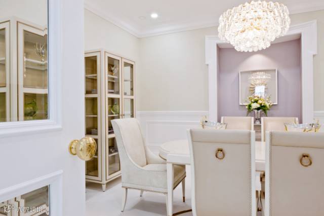 干净明亮的象牙白+金属色的欧式风格装修,会令你的餐厅风格光彩夺目,配合造型典雅的桌椅与华丽吊灯,高逼格餐厅不是梦!