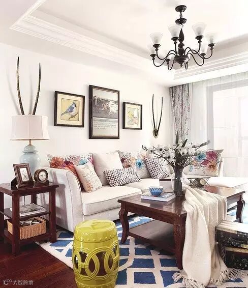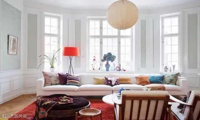▲在抱枕和地毯上花点小心思,就连悬挂的吊灯,都会让客厅别具一格