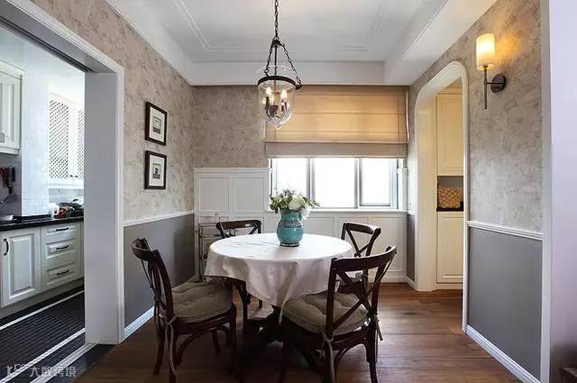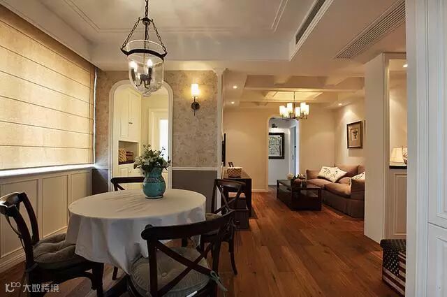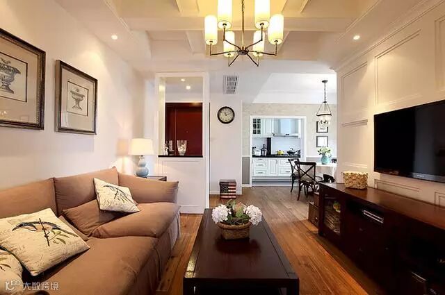 这个美式装修的案例:布艺沙发、实木家具、铜质吊灯、勾勒线条的石膏背景……这些在美式风格里必备的元素,一同呈现了一套十分循规蹈矩的温馨美式小婚房。