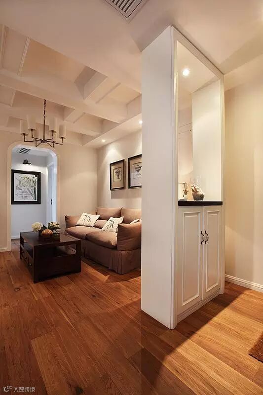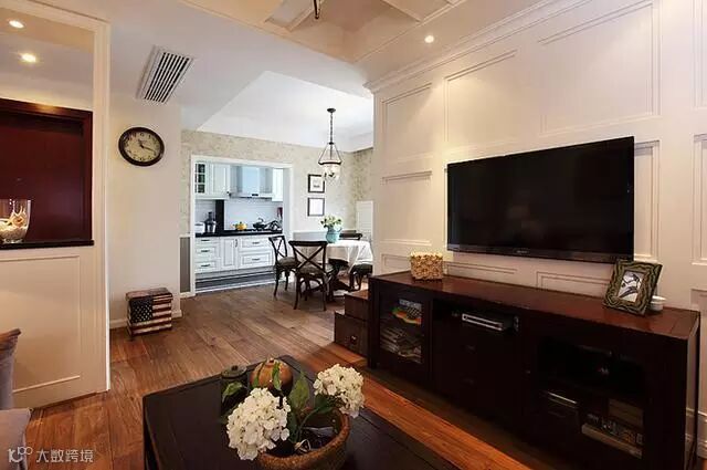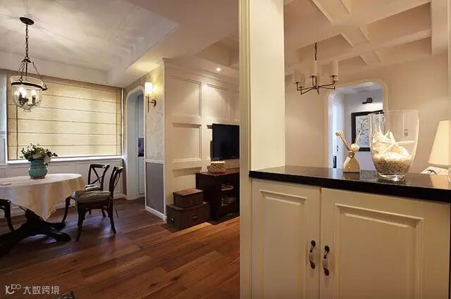 柜门、门套、吊顶、电视背景墙虽然都选择了白色(或乳白色),如果你细心观察,会发现设计师在处心积虑地勾勒格子状的线条,营造有层次感的居室氛围,这是美式风格常见的手法。