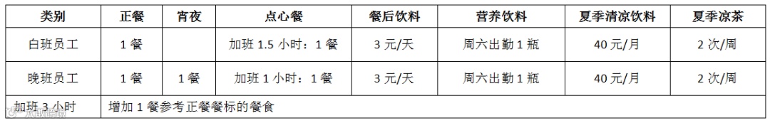 为员工每人每天提供一餐免费工作餐、为晚班员工提供晚餐及夜宵