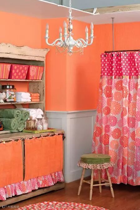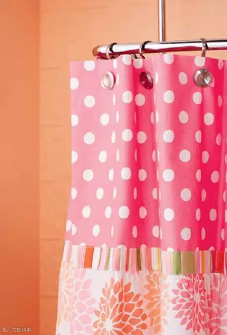 一般的浴帘花样单一,将带有圆点图案的宽边布缝在浴帘的帘头部位,剪一截丝带盖在接缝处缝好。在浴帘的顶部做出12个等距的扣眼,用作穿挂钩。与众不同的浴帘会是一道亮丽的风景线。