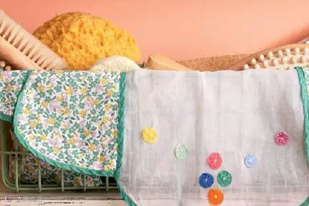 右边灰色的擦手毛巾平淡无奇,但在其下摆处绣上藕荷色的圆点,一下子就俏皮多了吧。同样,左边这条藕荷色毛巾的底边接上一块有同色系图案的花布,然后用丝带盖住接缝处,平庸的擦手巾马上变身浴室装饰物。