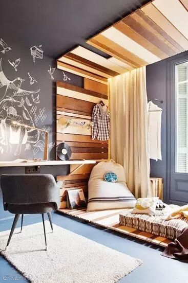 木板除了拿来踩、贴墙上装饰之外,还可以用来坐。不管是做成榻榻米、椅子、穿鞋凳还是木楼梯,保持木板表面的平整光滑,维持木纹的本色,使用中避免木刺的扎伤,局部的浅色点缀还能使细节更加柔和。