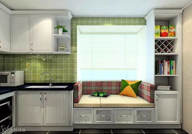 厨房的飘窗也是可以大胆设计的地方,与储物式卡座结合,既增设了一处休闲角落,又满足了厨房储物较强的需求。
