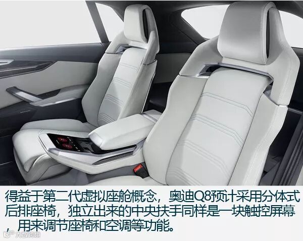 为了匹配前卫的外观设计,奥迪Q8的内饰自然也科技感十足。最吸睛的地方就是整个中控台基本上都被液晶屏所覆盖,几乎看不到什么实体按键。操作系统作为炫技的重要部分,奥迪Q8的空调控制类似操作智能手机,通过两个手指缩放按键就能达到准确控温。环视车厢,第二代虚拟座舱概念连后排也没有放过,后排中央扶手也采用了多点触控屏幕,控制车内空调和座椅。奥迪Q8太过张扬的科技配置,以至于让我突然觉得这是一部四个轮子的手机,而不是汽车。