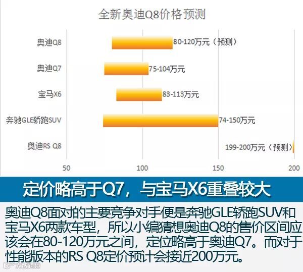至于定价部分,由于奥迪Q8面对的主要竞争对手便是奔驰GLE轿跑SUV和宝马X6两款车型,所以小编猜想奥迪Q8的售价区间应该会在80-120万元之间,定位略高于奥迪Q7,和销量最好宝马X6高度重合,先把生命周期接近尾声的宝马PK掉。又能利用奥迪品牌配置普及度高的特点,通过性价比的优势冲击奔驰将近150万元的顶配车型。