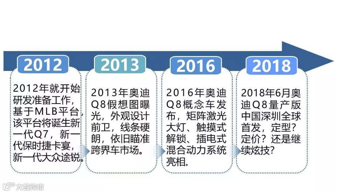 (转自车先知)早在2012年,奥迪便着手规划全新跨界中大型SUV——奥迪Q8车型,以应对老对手奔驰和宝马分割豪华跨界SUV细分市场的局面。直到近日,奥迪官方才确定消息称,全新Q8量产版车型将在6月5日于深圳完成全球首发。作为大众MLB EVO平台下的产物,全新奥迪Q8到底有什么过人之处?为何相比对手姗姗来迟,却又底气十足的在中国进行全球首发?这将是我们本文要细说的内容。