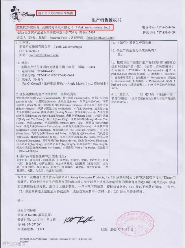 RoomMates迪士尼授权书,其中的约克墙纸有限公司就是制造RoomMates的公司~