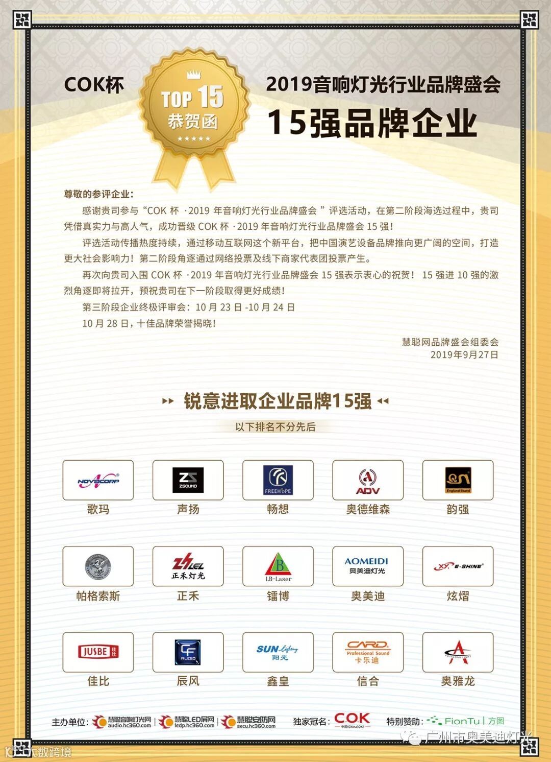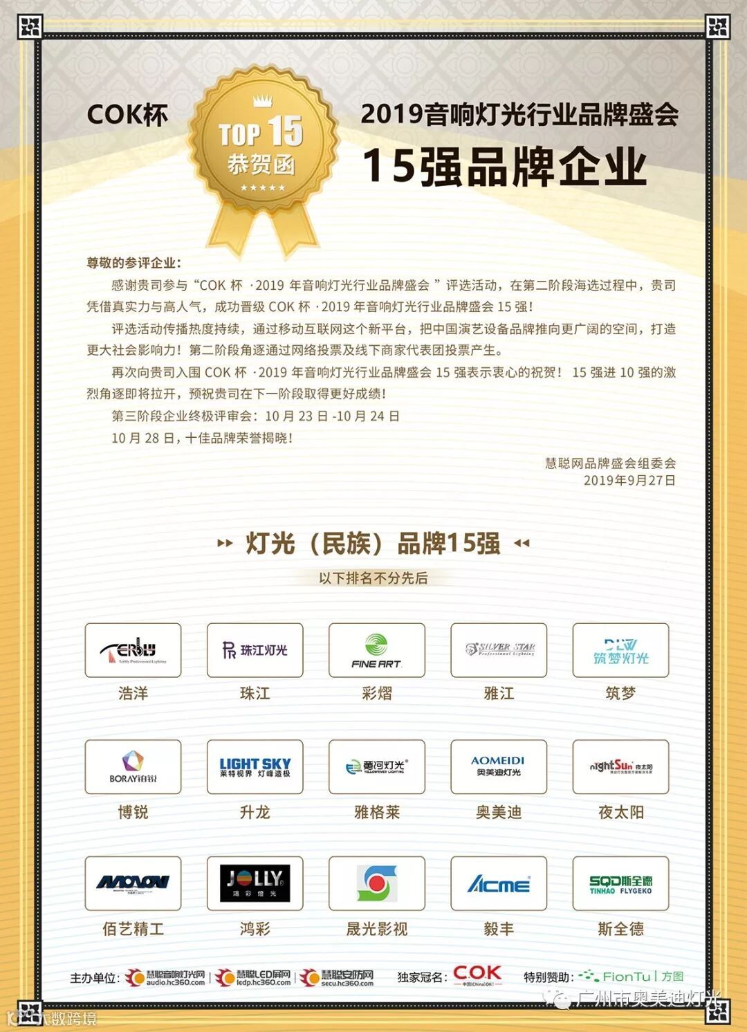 截至9月26日下午5时,由慧聪音响灯光网主办的COK杯·2019年音响灯光行业品牌盛会第二轮评选活动终于落下帷幕,十佳品牌企业30强晋级15强名单名单火热出炉!奥美迪晋级灯光(民族)品牌和锐意进取品牌双项十五强!