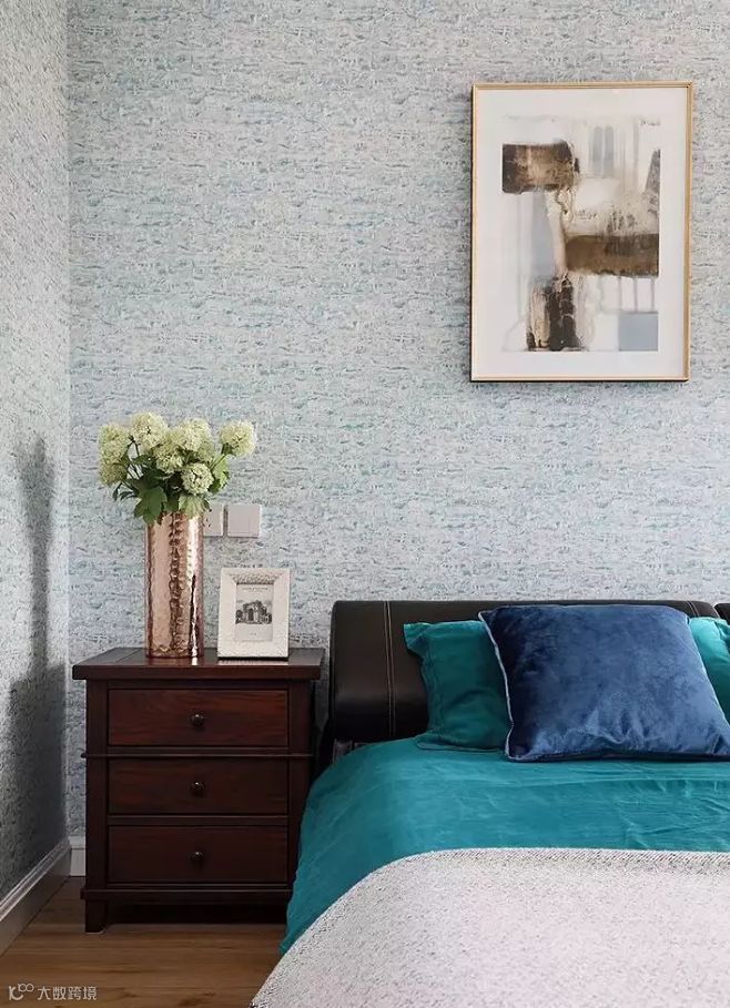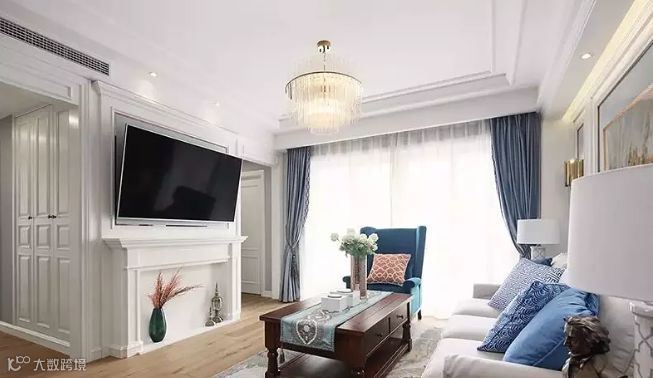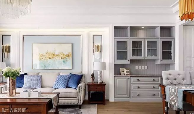客厅空间色彩整齐划一,白色的墙面、天花板与木本色的地面相结合,搭配美式风格的家具,尽显空间的淡雅与细腻。通过运用几种点睛的颜色,营造出温馨浪漫的生活气息,让幸福感在空间中升华。