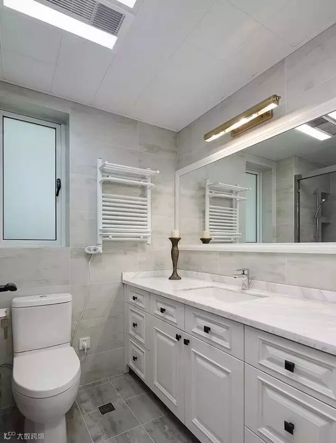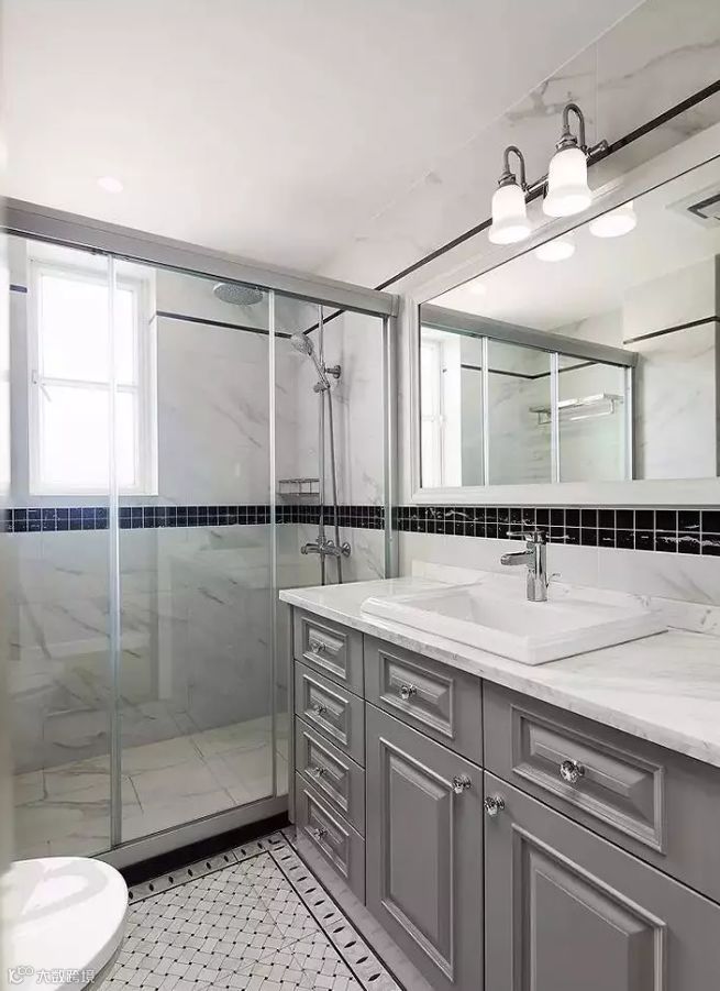 主卫采用编织纹理的地砖,黑色腰线,让简洁明亮的空间不止于实用。干湿分离的设计让空间更加整洁明了。