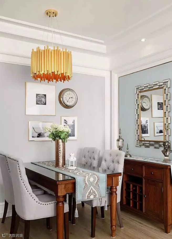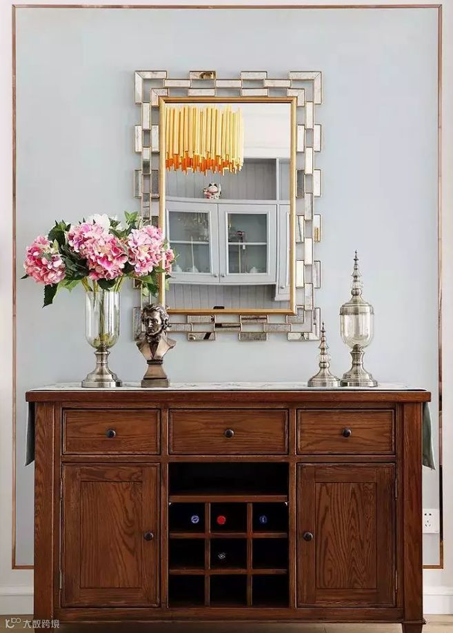 充满美式气息的镜面装饰和独特的软装摆件与木质餐边柜相搭配,实用且大气,展现了浓郁的美式风情。
