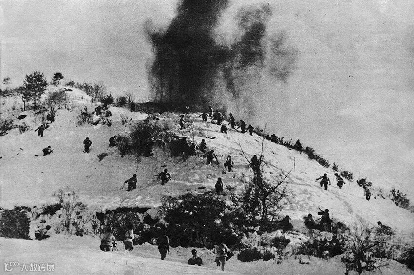 1950年12月,长津湖北部地区外围战斗中,中国人民志愿军第27军某部8连战士们拔除敌人最后一个据点,从四面八方攻入新兴里。(张崇岫/摄)