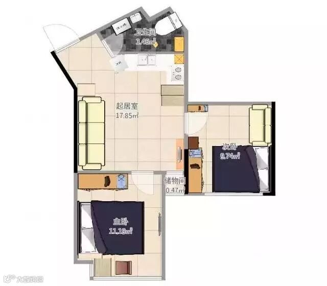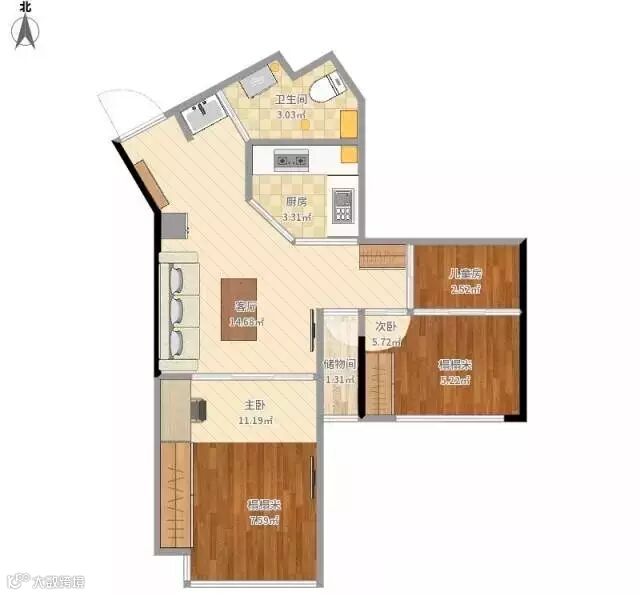 需求三:这奇葩的户型,玄关和卫生间是歪斜的卫生间怎么布局,厨房是想要封闭的。