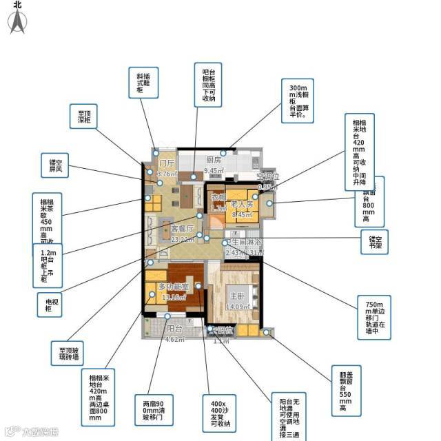 04 空间小,还要收纳多。所以,主卧和次卧都设计了榻榻米。榻榻米上做到顶衣柜,既不浪费空间,也方便收取衣物。而且榻榻米下面本身就是超大收纳空间,能放很多杂物。最方便的是,榻榻米这个抬高的木质地台,可以做为小孩子的安全游戏空间。(看参考图)