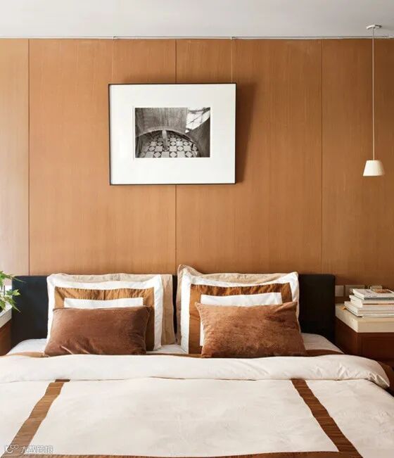 卧室和床品的颜色,与客厅、书房保持一致,都是庄重清雅,又不失暖意的黄褐色。
