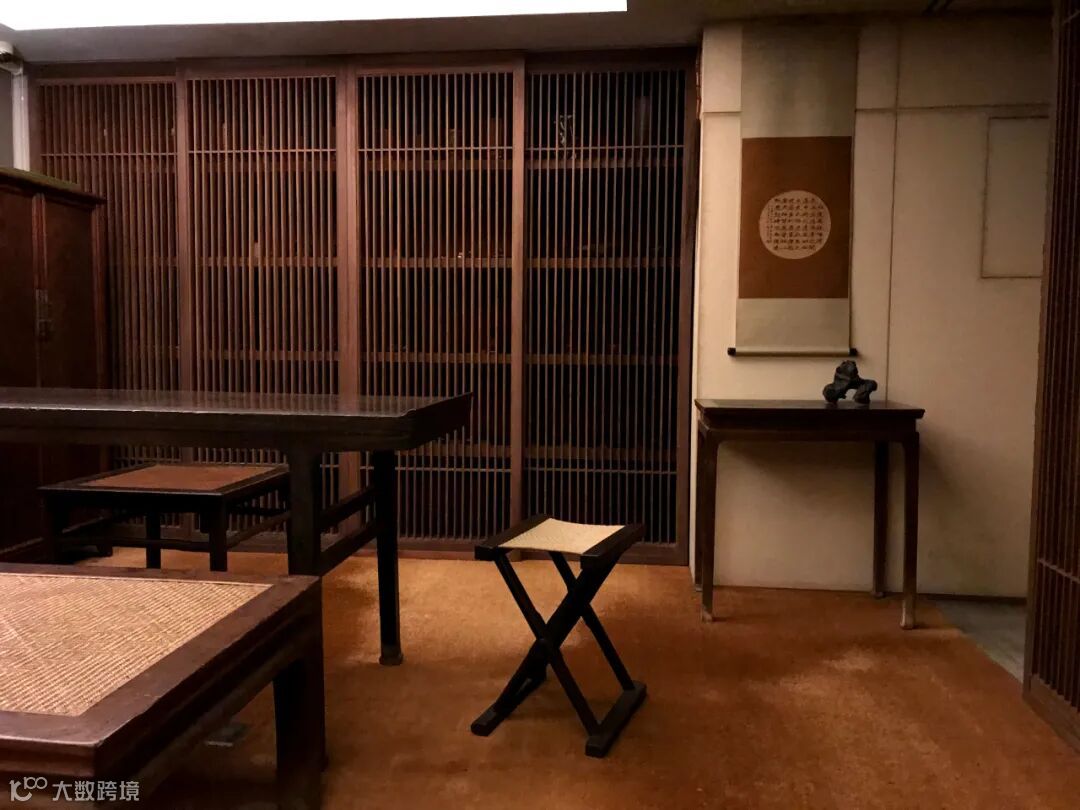 从大厅向右走,经过一面青石砖墙,就是大书房,四面书柜的书房裡,只有一张明式大木桌、和四张黄褐色沙发椅。