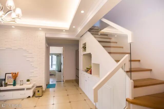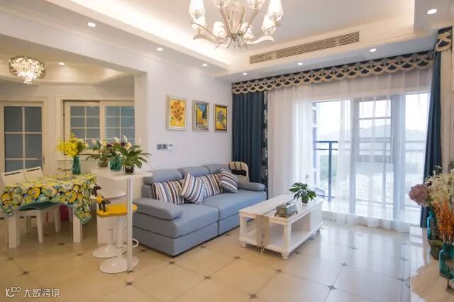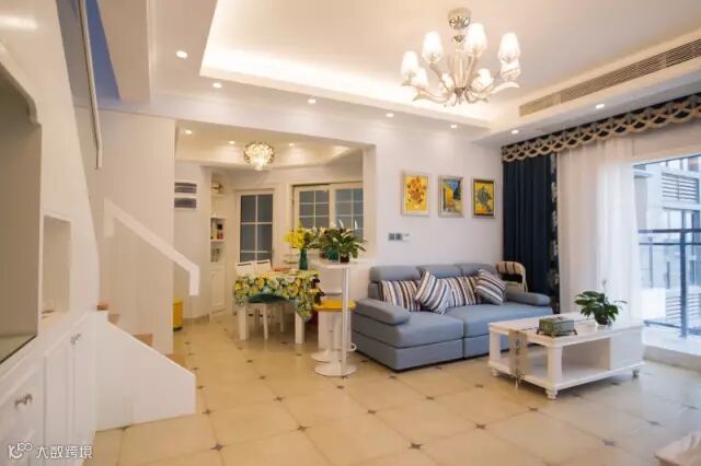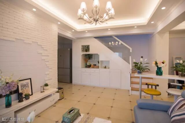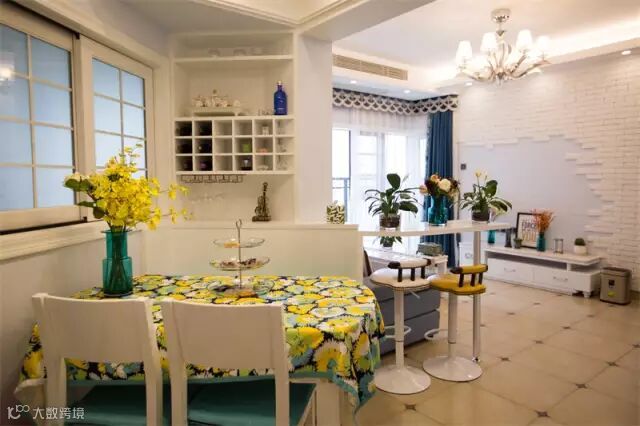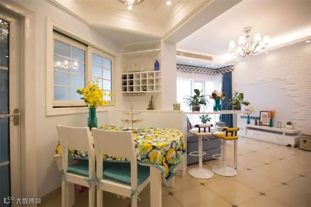 ▲利用了异形的原始结构,巧妙的融合了客厅与餐厅的空间,在转角处设计了吧台,既是分界线又像是连接的纽带。