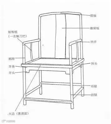四出头官帽椅的基本形制是椅的搭脑和扶手均出头。早期其搭脑、扶手、联帮棍均是直材,联帮棍上细下粗,鹅颈稍弯,后经过发展,产生了使用弯材的官帽椅