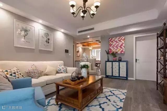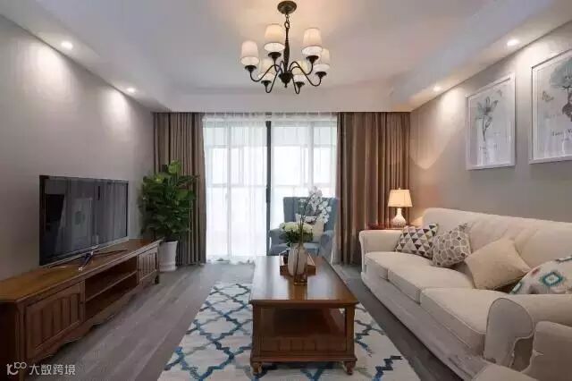 ▲ 第一眼就不禁感叹到,原来美式也可以如此简洁、明快。整体装修在吸取了美式经典元素的基础上,突出生活的舒适自在。客厅与阳台之间采用了玻璃推拉门的形式,让阳光可以充分融入到客厅,视线上也更显宽阔,实现室内与户外美景的完美连接。