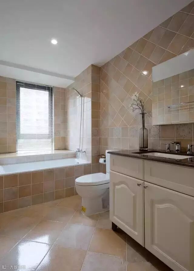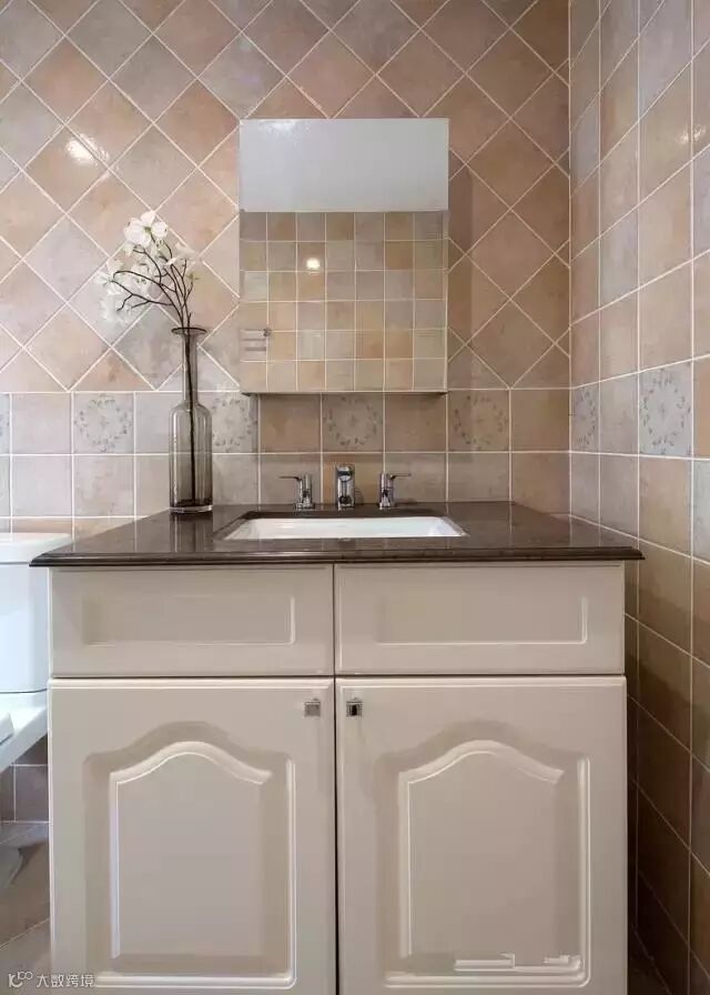 ▲ 卫生间内没有繁复的设计,地板和墙壁都贴了柔和色调的花砖,搭配白色的美式浴柜,完美诠释了古典与清新的结合。
