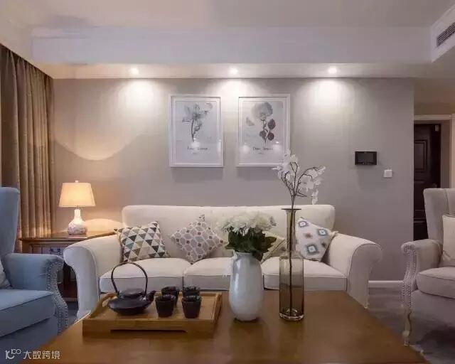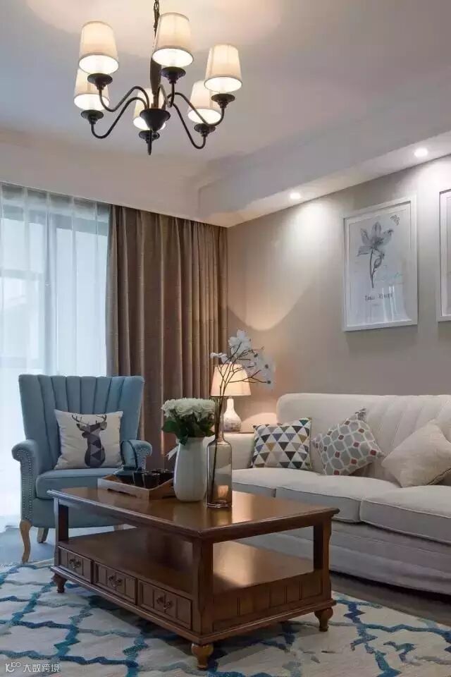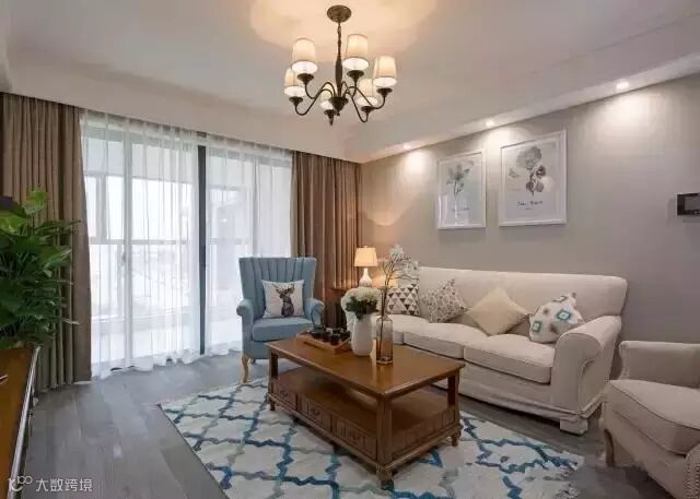 ▲ 白色布艺沙发、花纹抱枕、实木茶几,搭配深色窗帘,温馨时尚感十足。蓝色的单椅房君好喜欢,坐上去一定特别舒服。