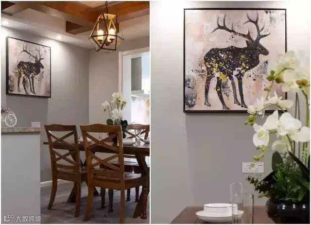 ▲ 餐厅顶面采用木格栅吊顶,搭配个性灯具、实木餐桌,再加上墙上一幅彩色的小鹿油画,整个空间营造出一种原始、浪漫的氛围。会画画的朋友不妨试着自己画一张挂在家里,相当有情趣呢~