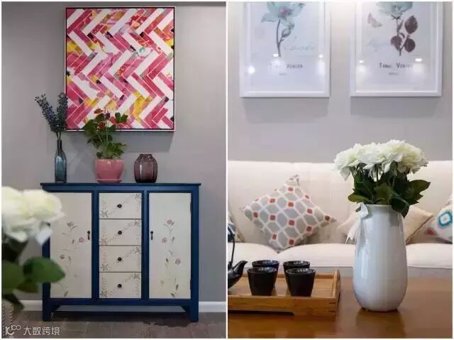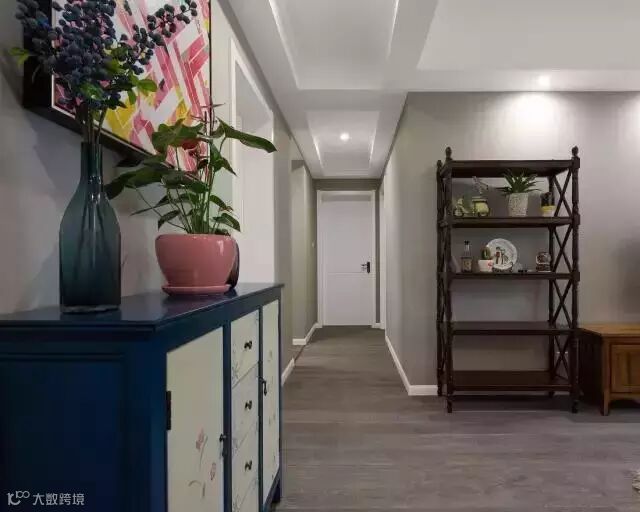 ▲ 靠墙的地方放置了一个蓝白相间的复古柜子,可以收纳一些小东西,即使单纯摆在那里也是一个不错的装饰品。我们的生活就是因为各式各样的美而变得更加新鲜有趣,也许是入门玄关处的一幅画,也许是柜子上的一盆花,也有可能是家里的一件摆设。