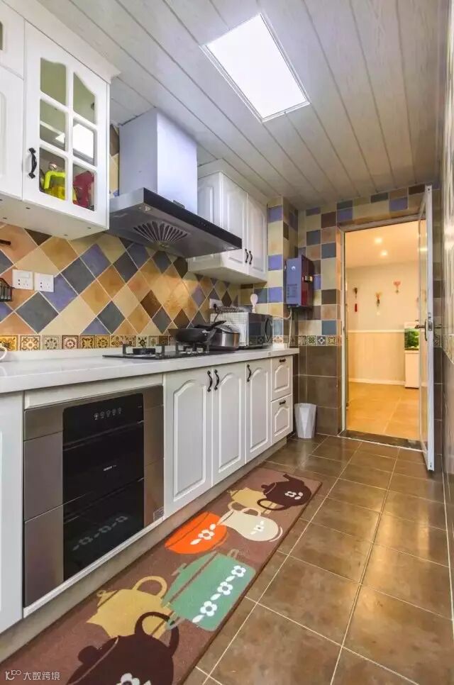 ▲厨房墙面采用彩色的仿古砖随机拼贴,搭配白色模压橱柜,中间用花砖作为腰线点缀。靠近灶台的地方铺了一块地毯,防止油溅到地上。
