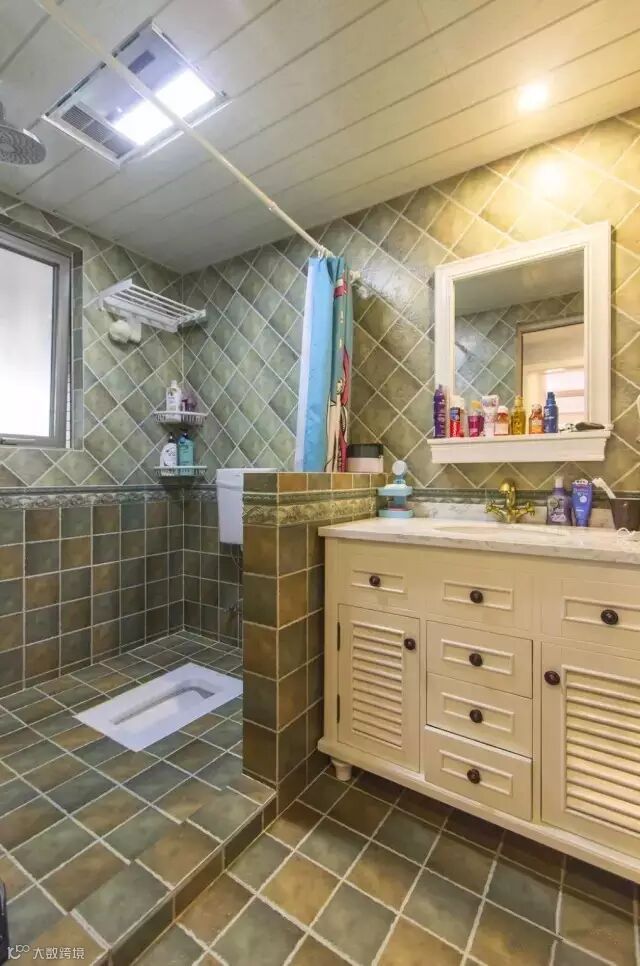 ▲卫生间干湿分离用浴帘代替玻璃隔断,适合小户型。卫浴间的设计也越来越讲究,如厕、淋浴、涮洗等都在卫浴间,这就不可避免地会弄湿周围环境。不仅需经常打扫而且会滋生大量细菌,因此干湿分离成为卫浴设计中很多家庭的首选。