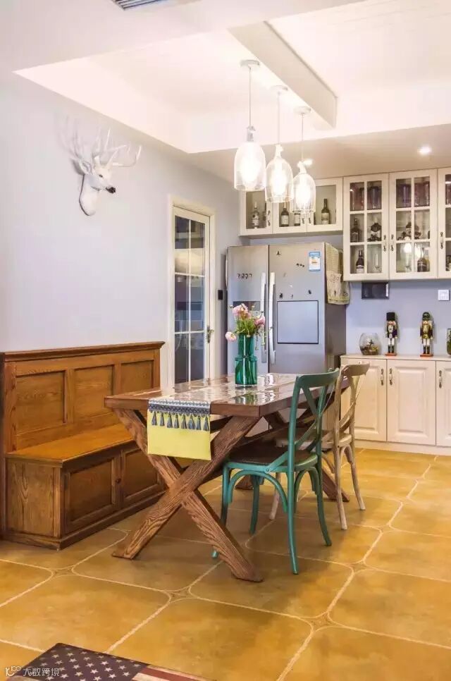 ▲餐厅卡座设计,墙上的鹿头装饰,餐边柜定制融合了酒柜功能,同时考虑了双开门冰箱的位置。