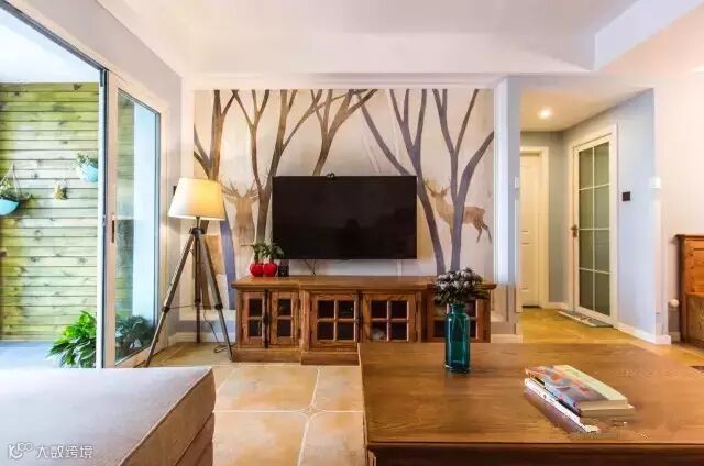 ▲客厅铺的是仿古砖铺地,电视背景用北欧风格的壁纸铺贴,阳台用木板制作花架,增添了自然休闲的气息。