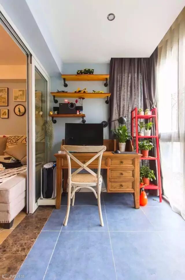 ▲阳台另一端是书房设计,放置了书桌和电脑,配上红色的铁艺花架,实用又显得文艺。把书房设计在阳台,光线是最好的地方。
