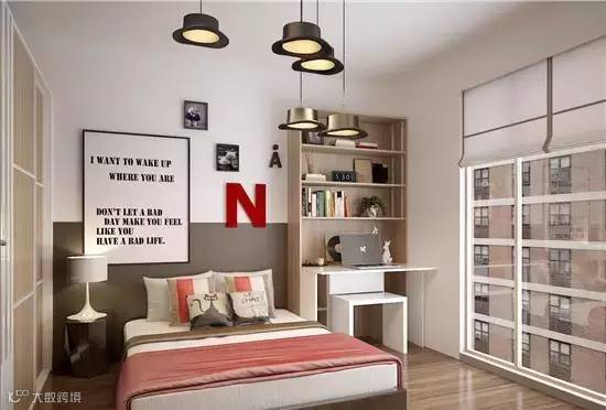 同样是放在角落里的床,不仅节省卧室空间,而且腾出了更多活动空间,让卧室更加宽敞,而右边空出来的位置则刚好可以定制一个书台。