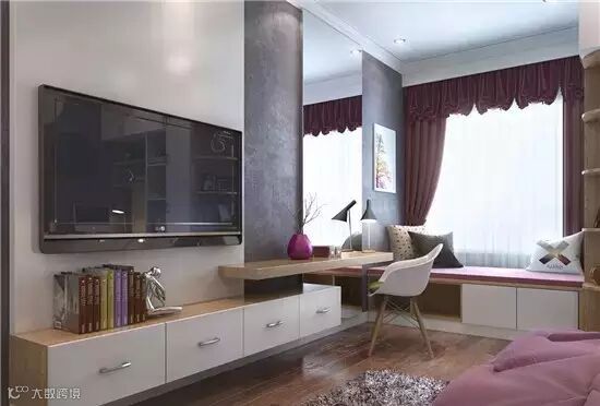 如果想要工作区,也可以这样处理,将书桌与电视柜衔接,一体化设计简洁利落,同样可以作为梳妆台使用。